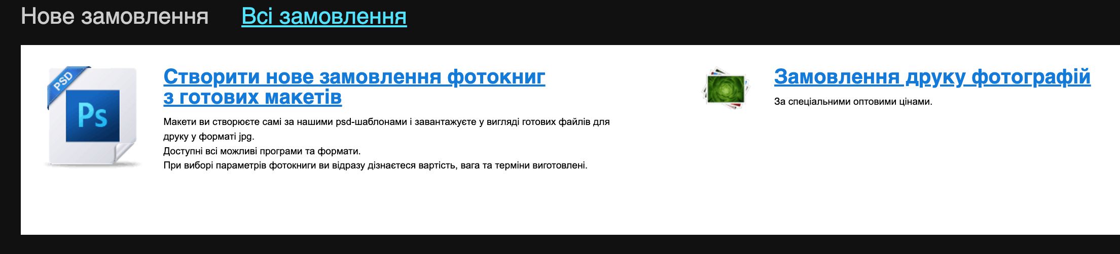 Після входу dи одразу потрапиnt на сторінку "Нове замовлення". Замовити фотокнигу можна з готових макетів. Ви можете робити замовлення за будь-якою програмою ("шкільною" та "весільною"), а також вам доступний весь асортимент продукції: у всіх форматах, типах обкладинки, паперу тощо. Розглянемо класичний варіант, коли у вас є макети, і ви хочете зробити замовлення. Натискаємо відповідну кнопку.