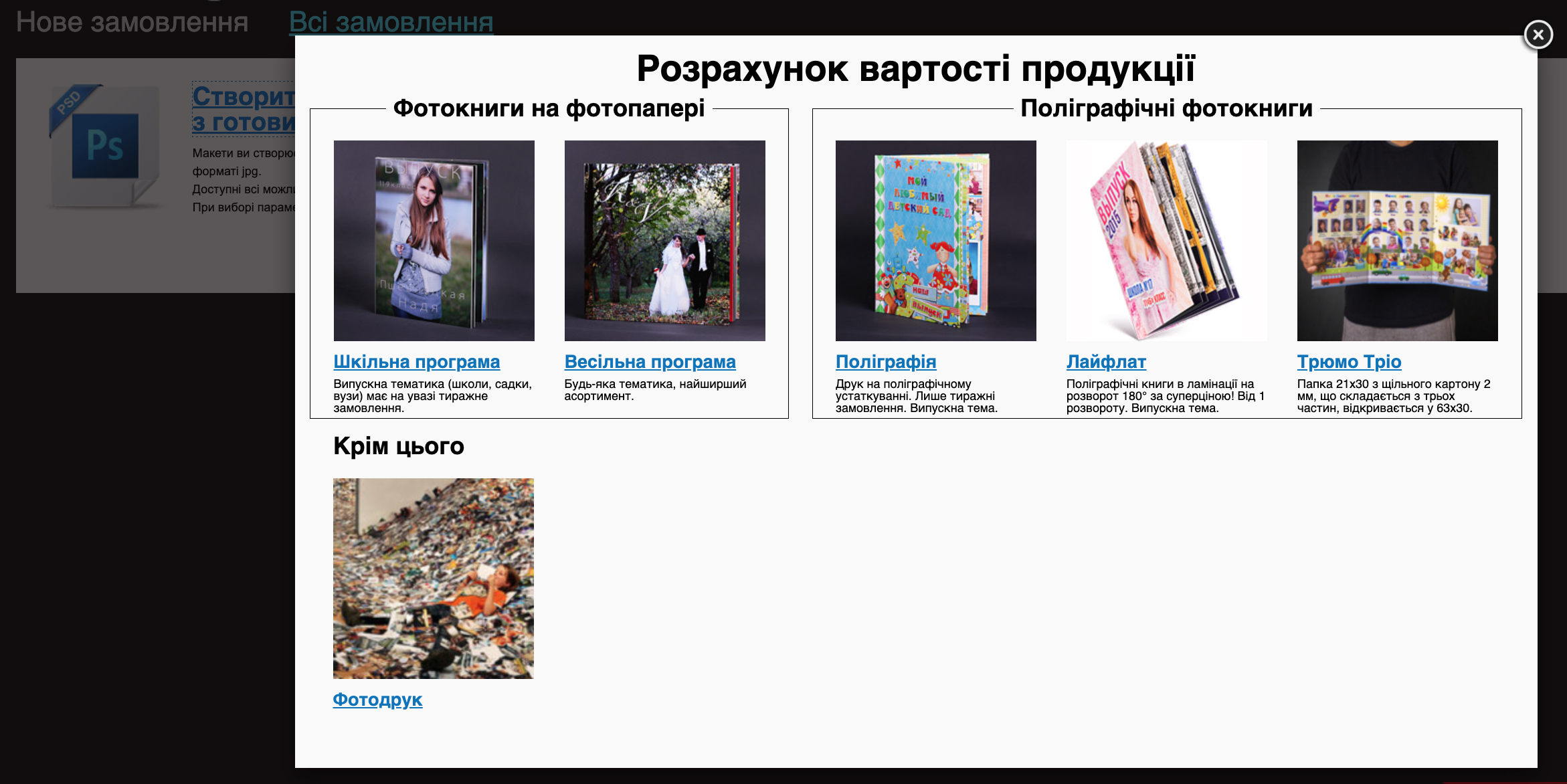 Створення замовлення, вибір макетів, оформлення