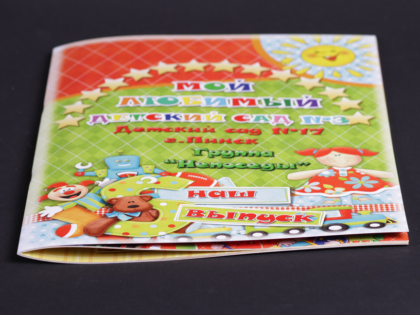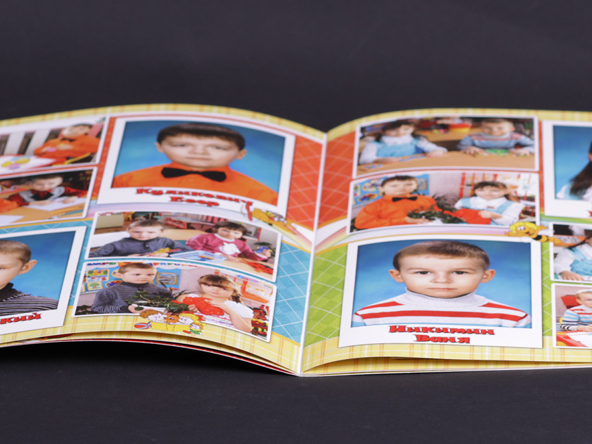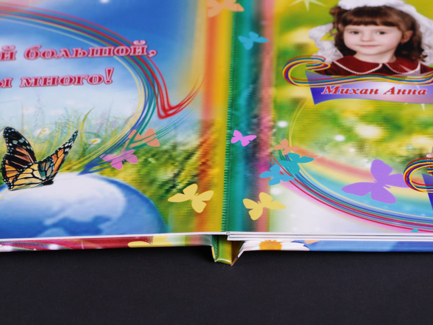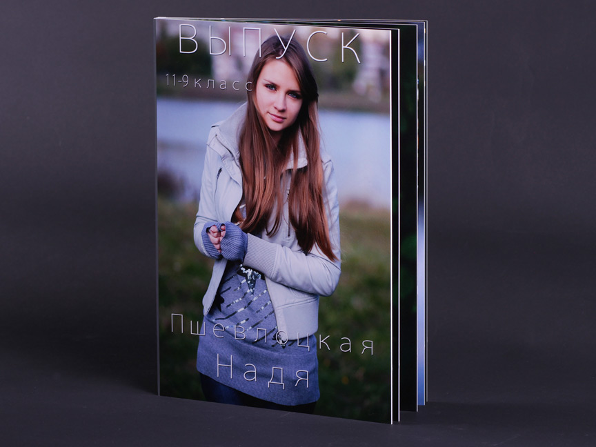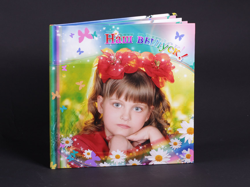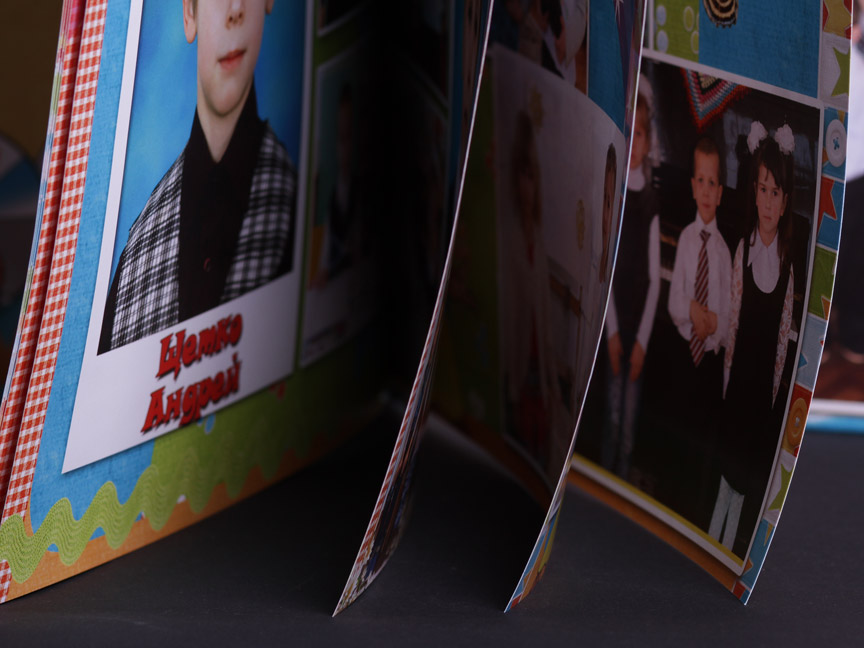 Доступно 7 основних кольорів шкірозамінника, є варіант із нанесення напису «Наш Випуск». Вибір форматів. Всередині блок надрукований на фотопапері. Від 1 розвороту.